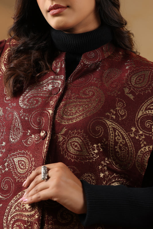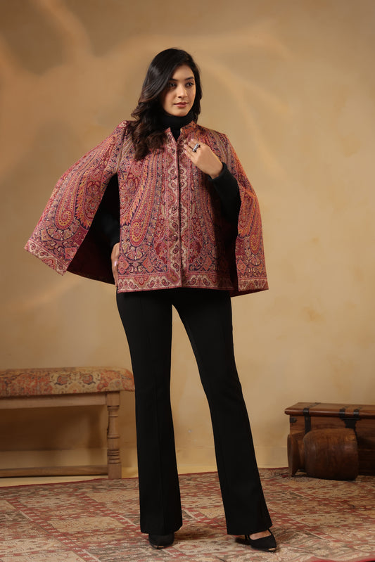 Women's Designer Zari Weave Paisley Cape Jacket | Wine