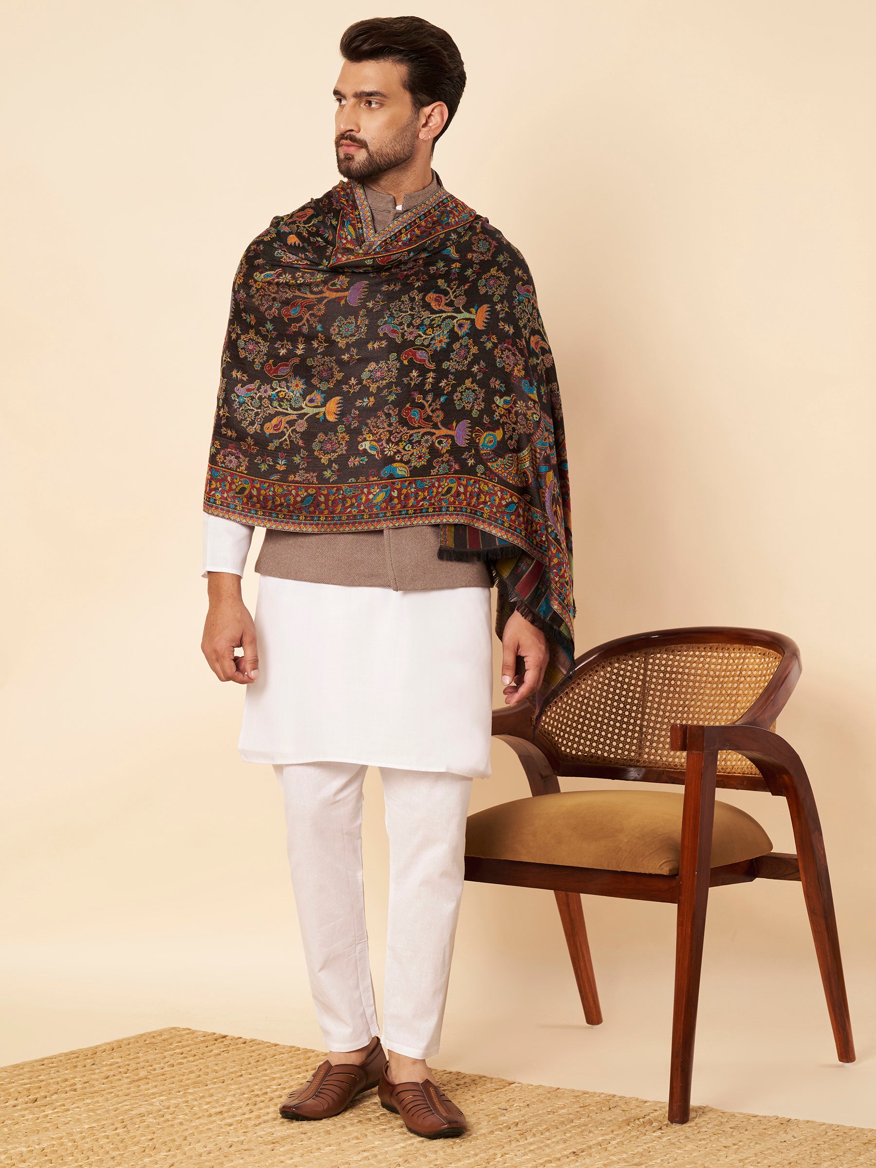 Kani Floral Weave Soft Woolen Stole for Men | Black