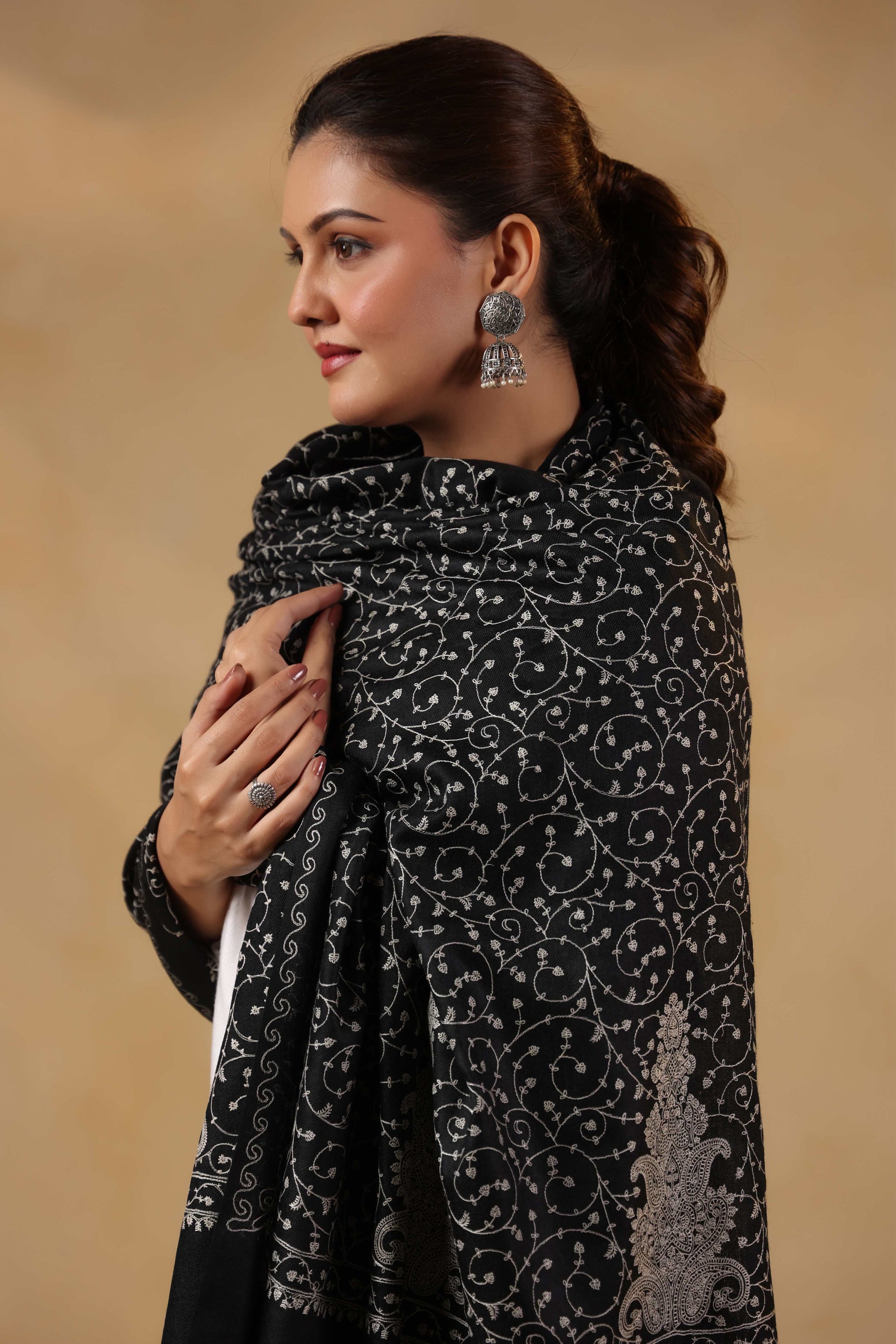 Kashmiri Jaal Embroidery Floral Shawl | Black