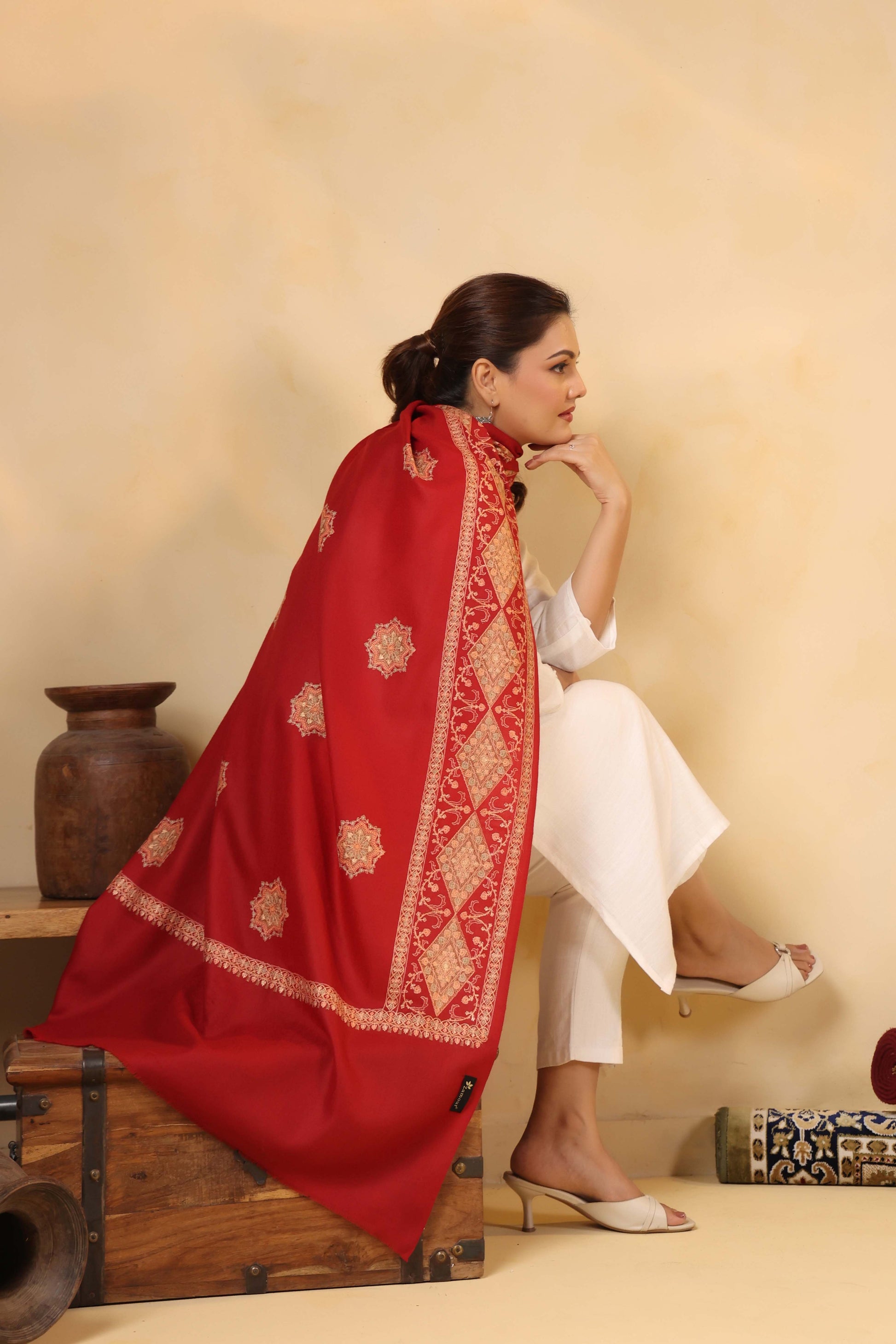 Kashmiri Sozni Floral Embroidery Shawl | Red
