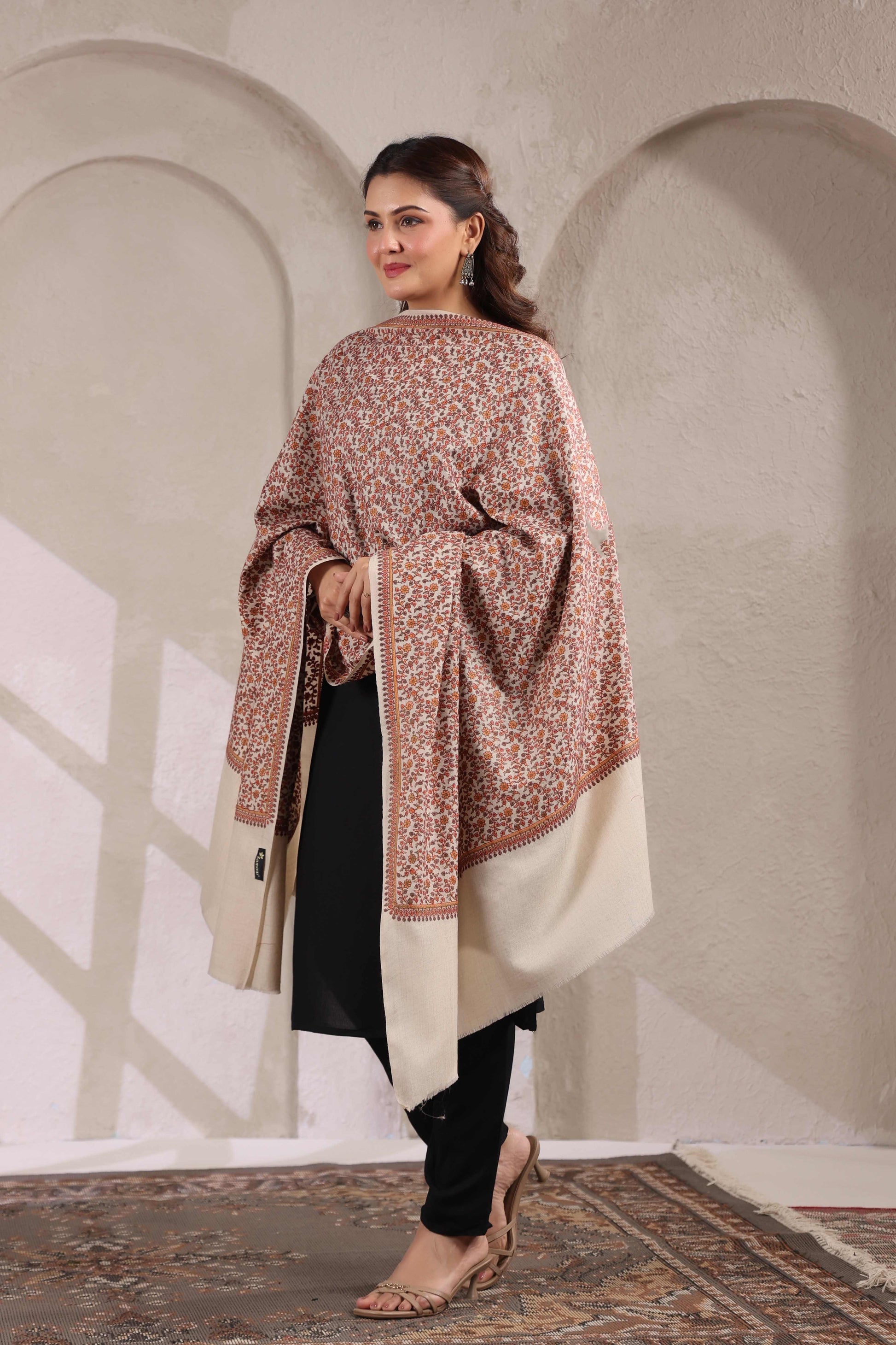 Pure Wool ,Light Weight , Pashmina Feel Shawl with Kashmiri Sozni Floral Jaal Embroidery Wrap for Winter