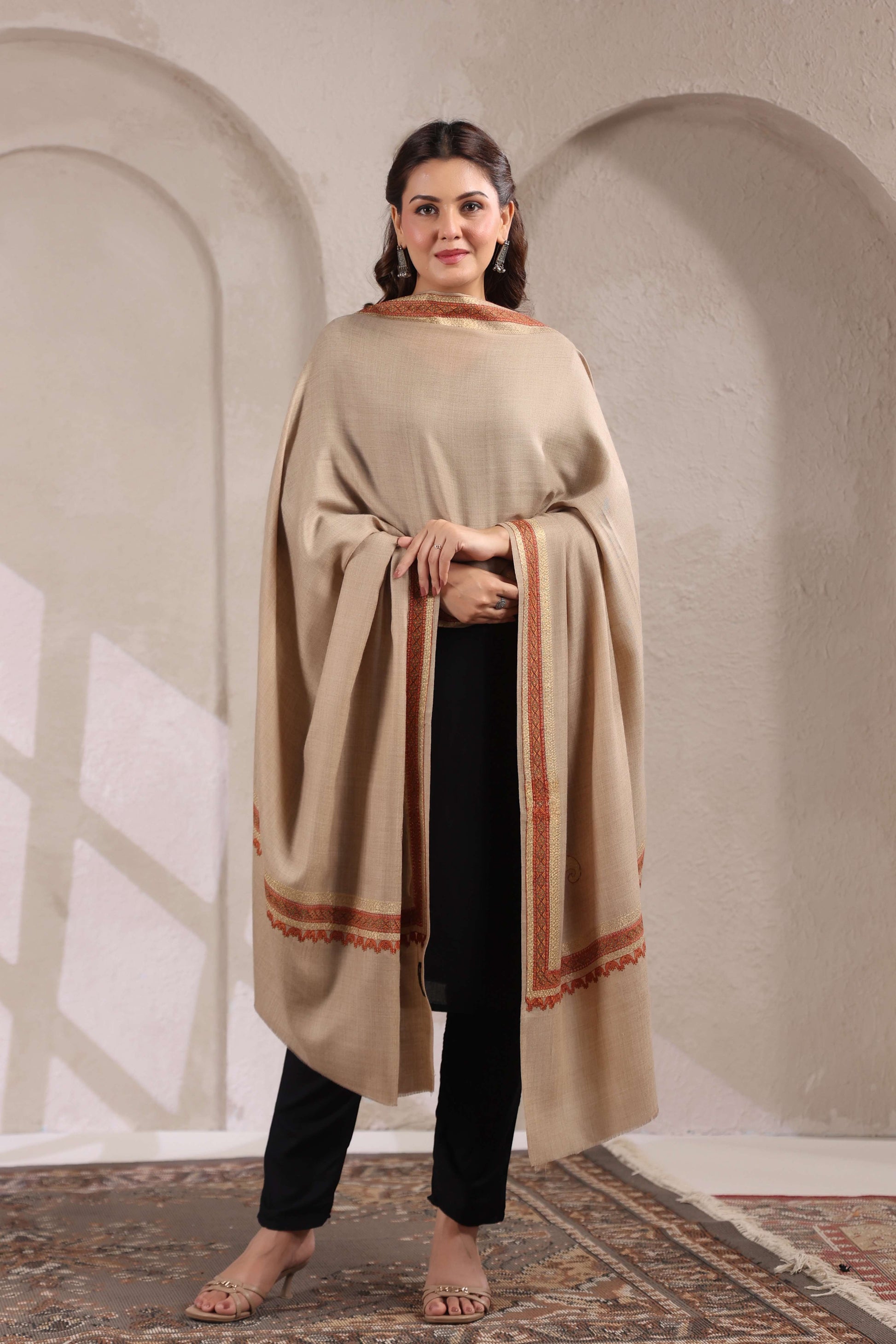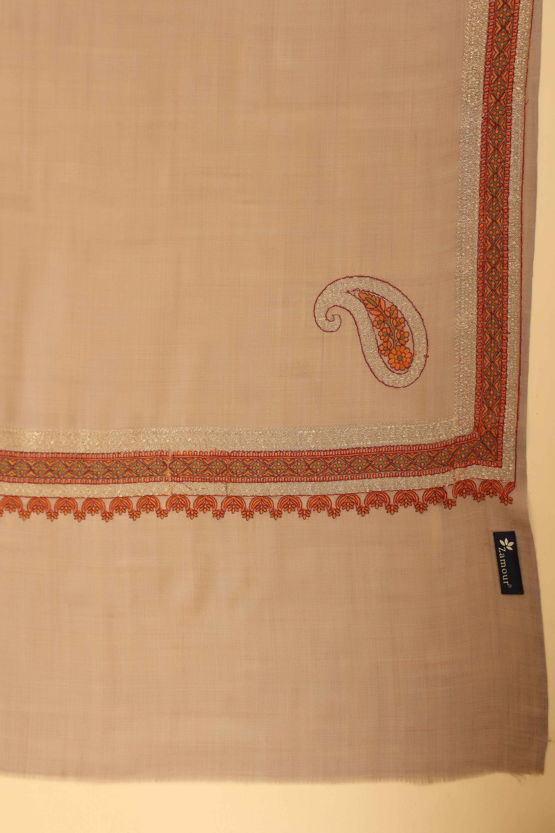 Kashmiri Sozni Zari Embroidery Shawl | Beige