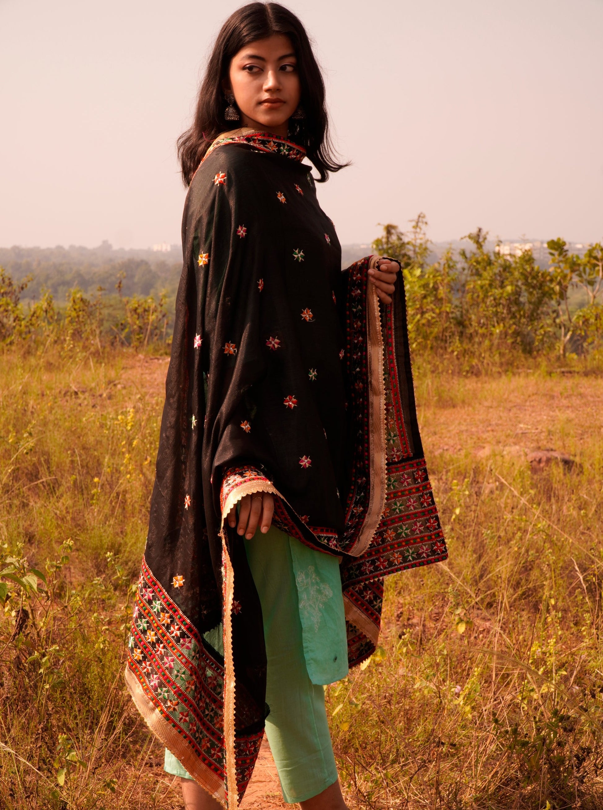 This women's Phulkari dupatta depict the Punjabi culture as they had been designed and manufactured in Panjab. It is crafted with multicolored shiny threads, suitable for all seasons and can be worn in winters and summers as well.