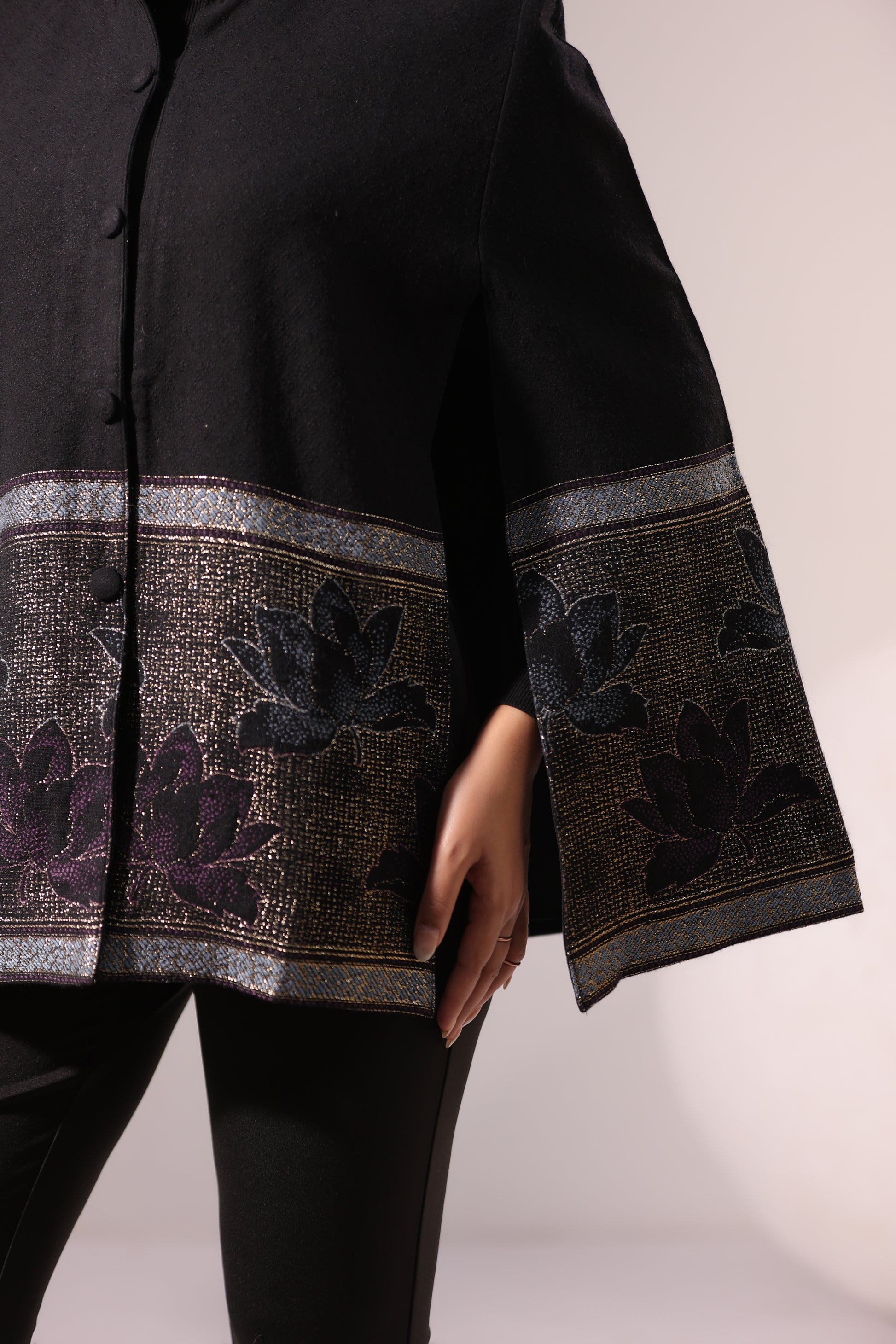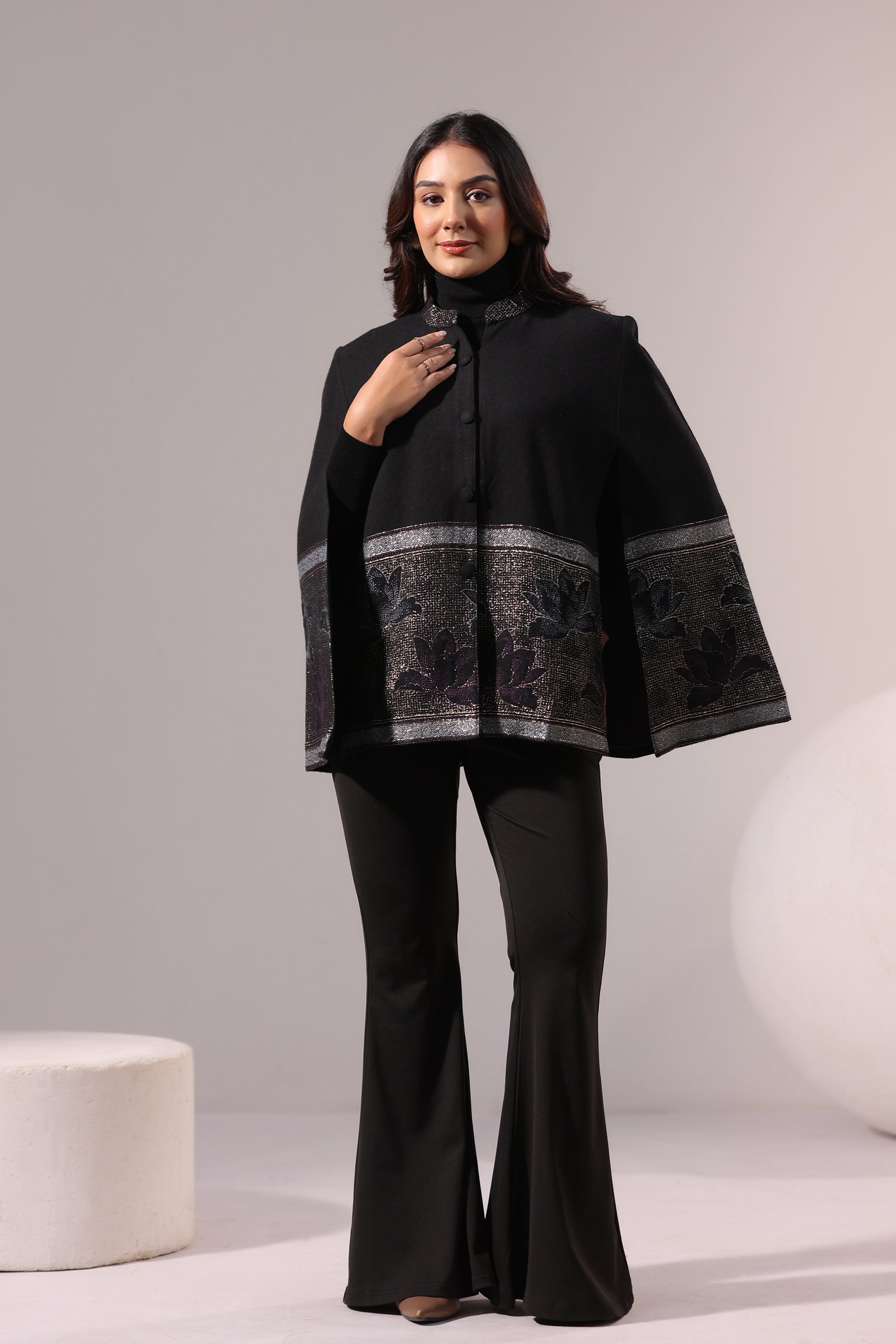 Wool-blend cape jacket with woven lotus border and subtle zari detailing. Open sides, front buttons for warm elegant drape over ethnic or western winter outfits.