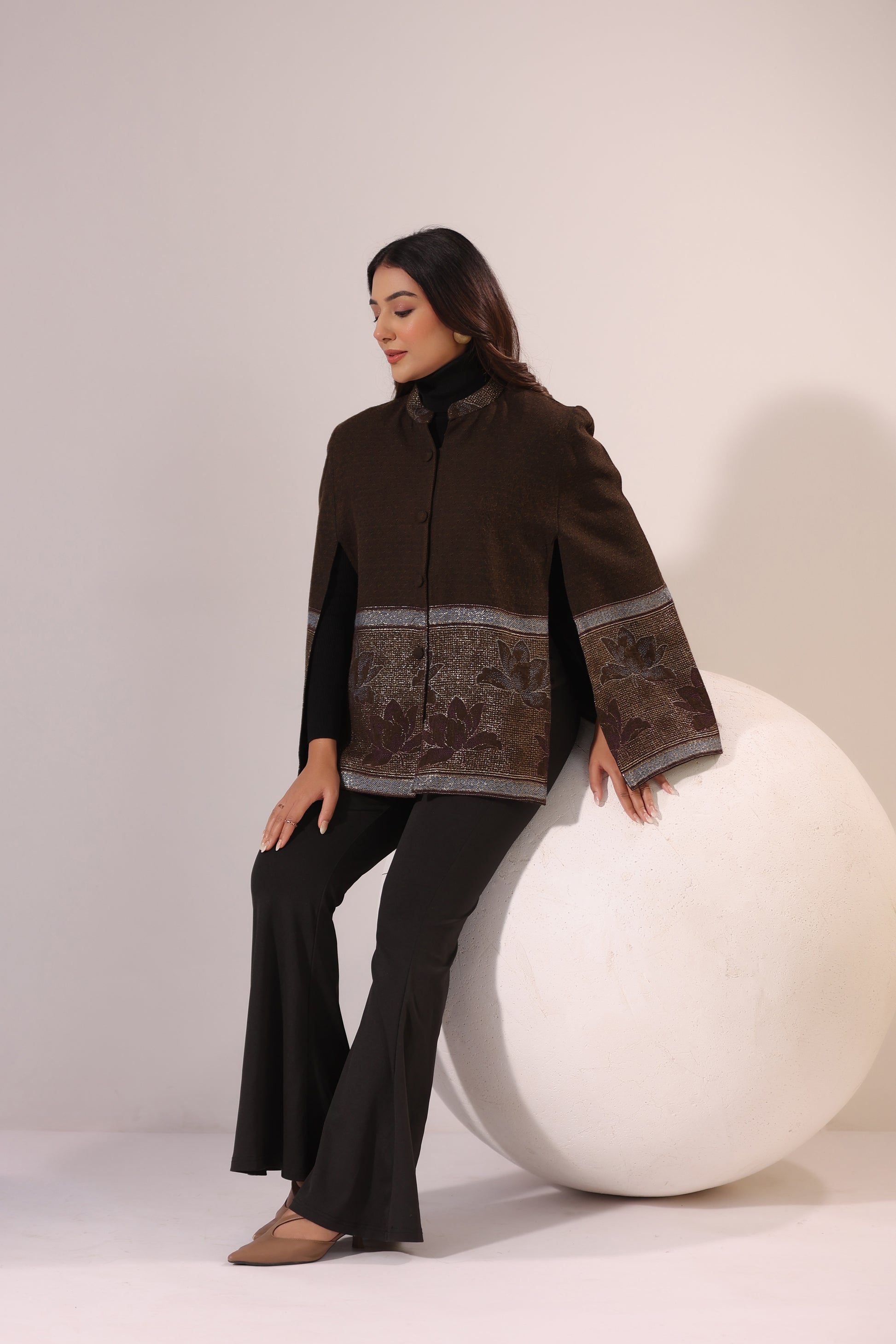 Wool-blend cape jacket with woven lotus border and subtle zari detailing. Open sides, front buttons for warm elegant drape over ethnic or western winter outfits.
