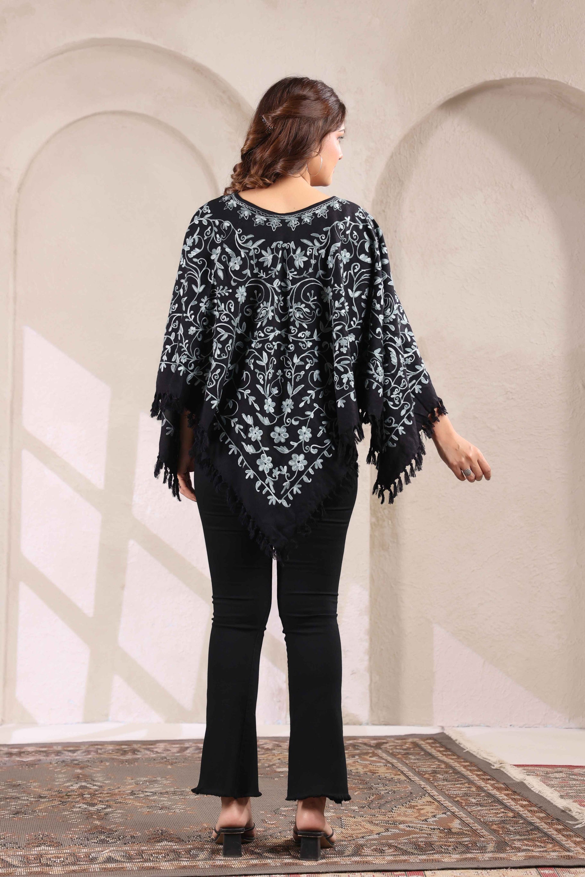 Woollen Poncho Top with Kashmiri Chinar Neck Hand Embroidery and Inner Lining | Black