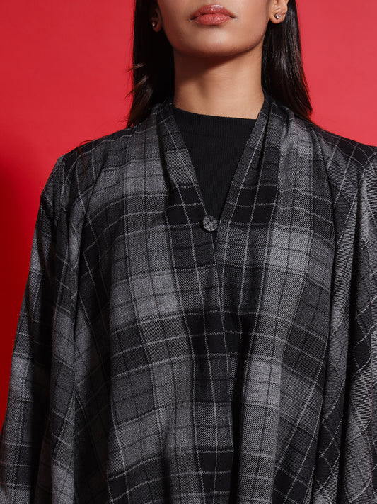 Women's Woven Full Sleeves Cape Shrug in Checked Pattern | Black