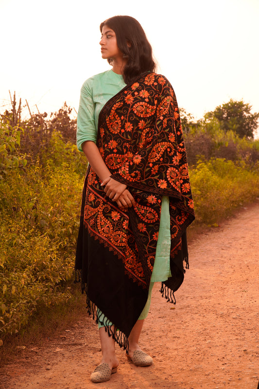 Punjabi Stole with Kashmiri Aari Jaal Embroidery | Black