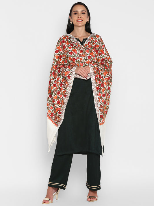 Women Kashmiri Aari Embroidered Woollen Stole | White
