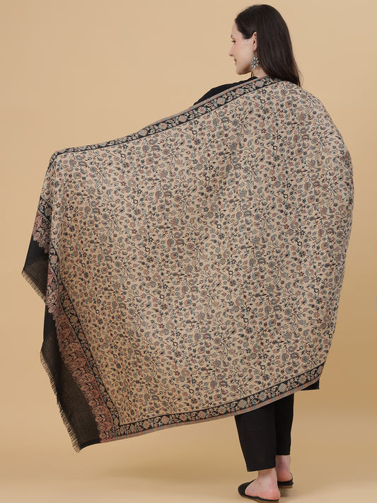 Two Tone Kani Weave Floral Motif Pure Wool Shawl For Women | Black Beige
