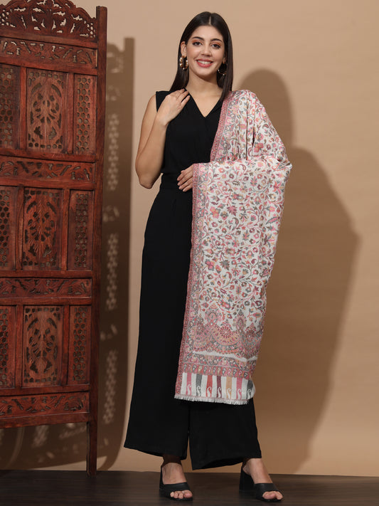 Kani Weave Floral Jaal Pattern Shawl For Women | White