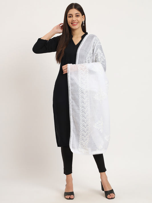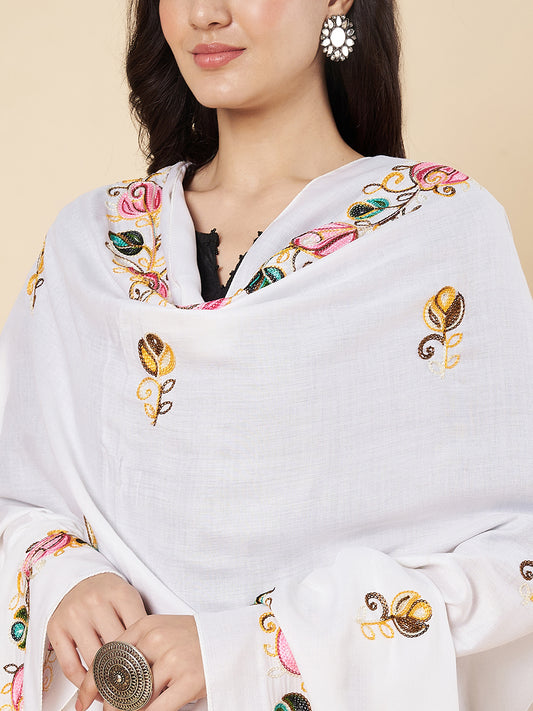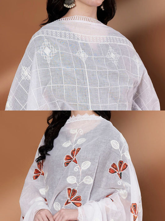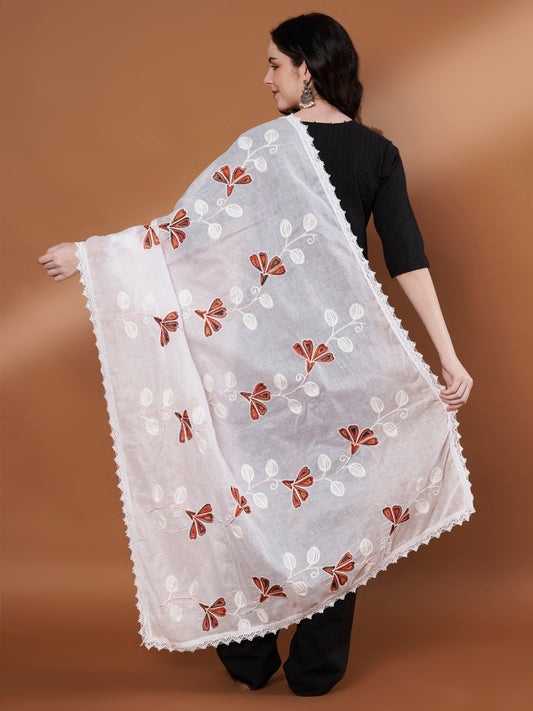 Women Floral Embroidery Pure Cotton Dupatta | White
