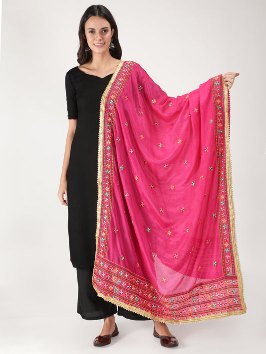 • Punjabi Phulkari Dupatta with Heavy Embroidery Border | Pink