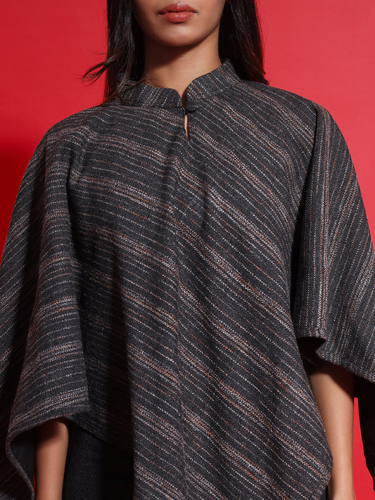 Woven Striped Cashmelon thick Poncho for Women with Mandarin Collar and Lining | Grey