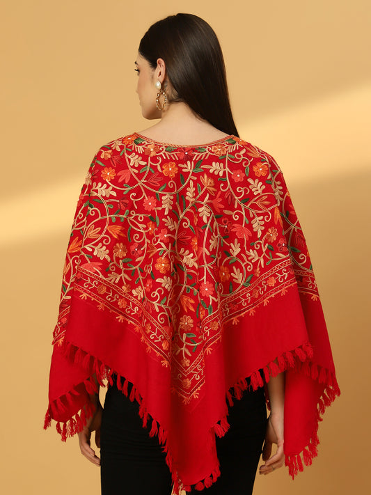 Woollen Poncho with Kashmiri Embroidery and Silk Lining | Red