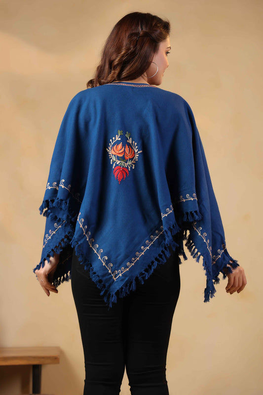 Woollen Poncho Top with Kashmiri Chinar Neck Hand Embroidery and Inner Lining | Blue