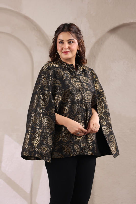 Women's Designer Zari Weave Paisley Cape Jacket | Black